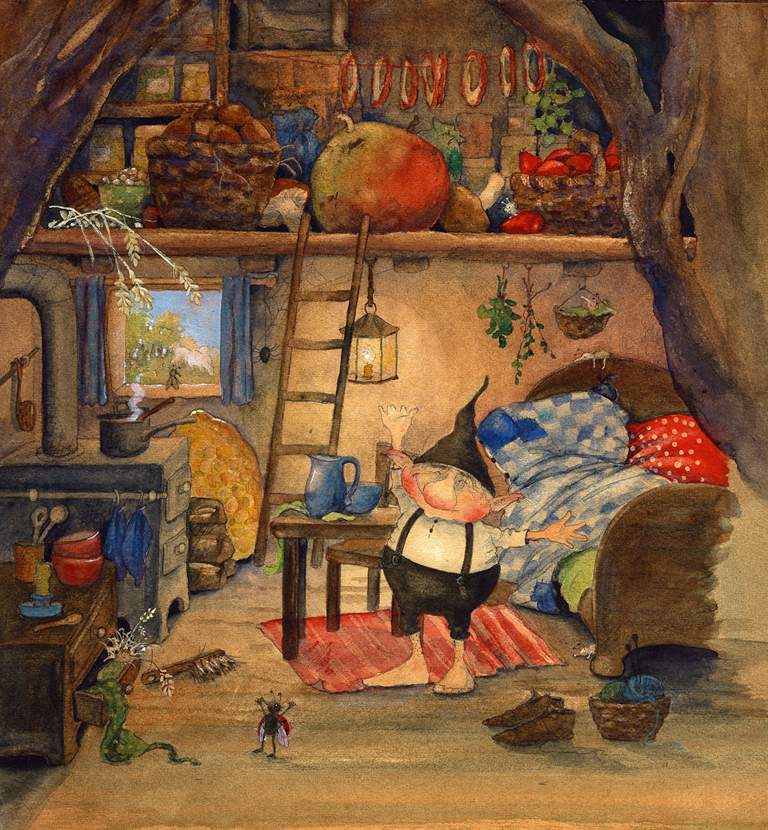 Als eines Tages ein heftiger Sturm um seinen Apfelbaum braust, ist dem freundlichen Wicht nichts zu waghalsig, um seine Freunde aus den Klauen des Unwetters zu befreien. Wie gut, dass sein Zuhause am Fuße des Baums so gemütlich ist, dass alle bei ihm Zuflucht finden …